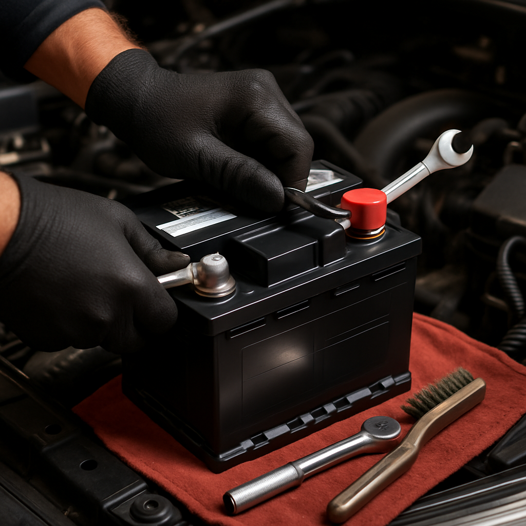 Prima di installare la nuova batteria, pulisci il vano batteria e i morsetti. Utilizza una spazzola metallica per rimuovere ossidazione e depositi di solfato dai morsetti. Una soluzione di acqua e bicarbonato di sodio (rapporto 10:1) neutralizza eventuali residui di acido.
